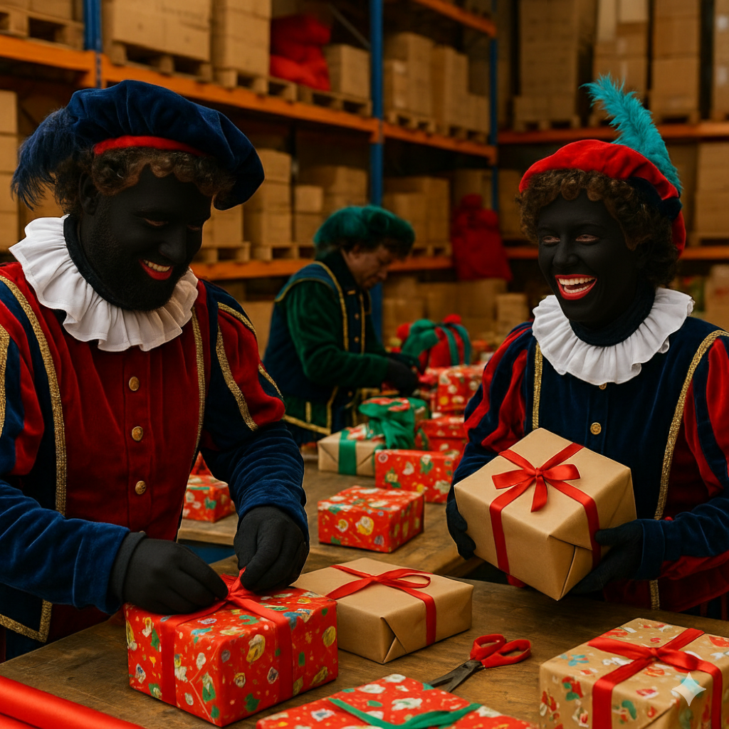 Zodra de eerste lintjes het daglicht zien, ontploft het magazijn als een soort workshop van een hyperactieve startup.Elke Piet heeft zijn eigen stijl.De ene maakt strakke, bijna zakelijke pakketjes — strak als een contract.